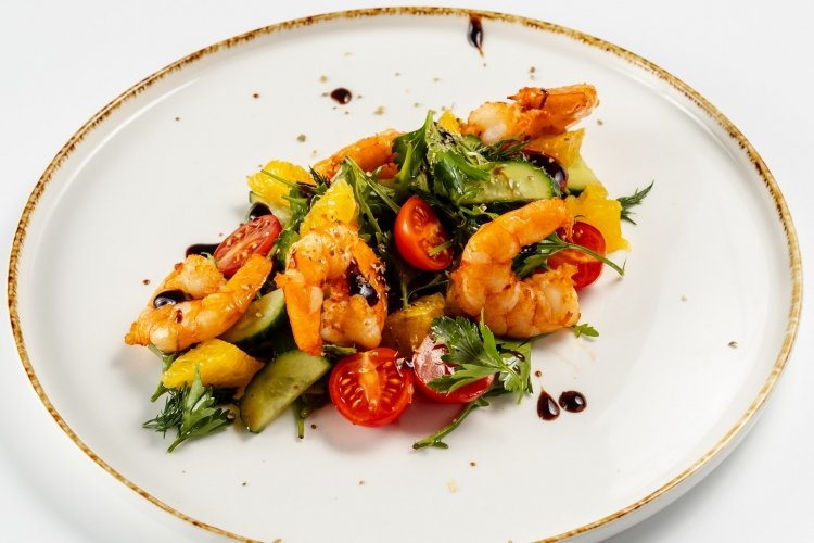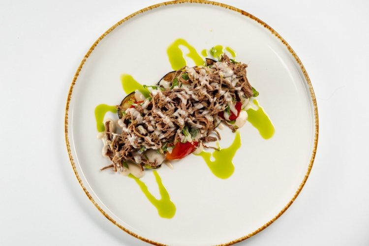 Нежный ростбиф со свежим миксом салатов, томатами, запеченным перцем и красным луком — гармония сочности и ароматов под соусом из соевого соуса и крема бальзамик.
