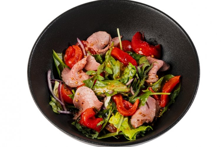 Свежий микс салатов с сочной говядиной, томатами и заправкой из оливкового масла, бальзамического уксуса, меда и соевого соуса — гармония свежести и насыщенности.