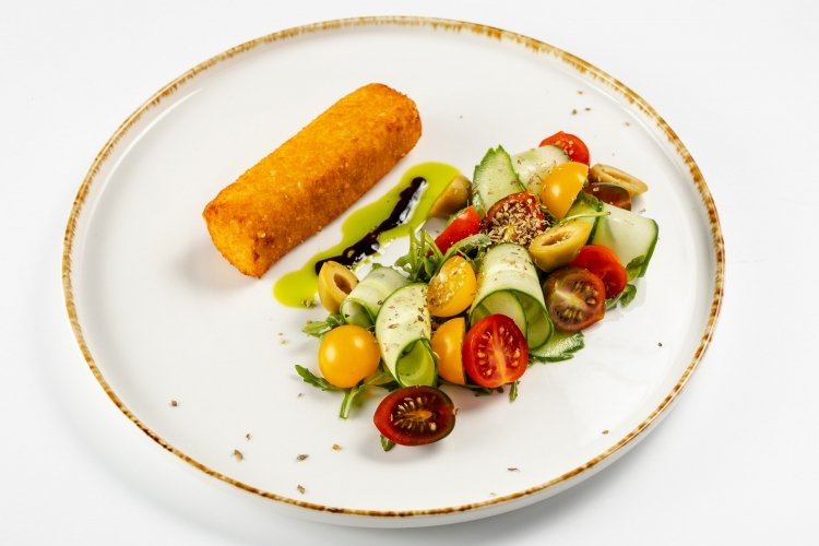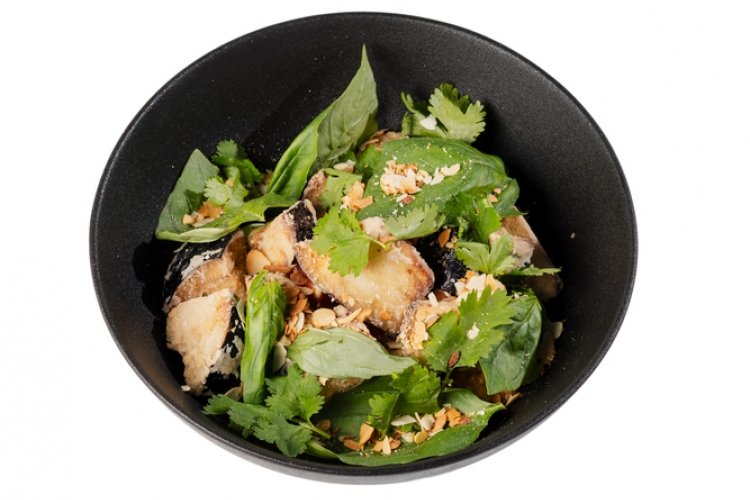 Состав: баклажаны, помидор, сыр креметте, соус чили сладкий, кинза