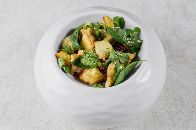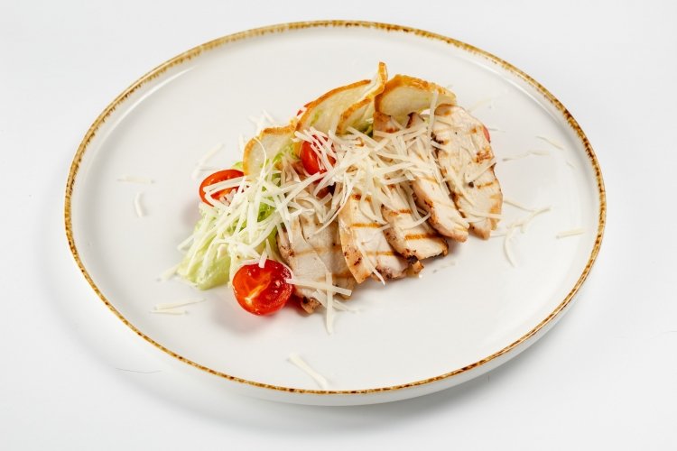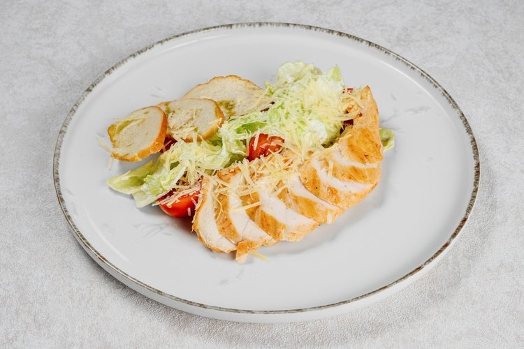 Нежное куриное филе с красным луком, томатами, огурцом и миксом салатов — гармония свежести и сочности, дополненная ореховым и песто соусами, чесночным маслом и жареным кунжутом для насыщенного вкуса.