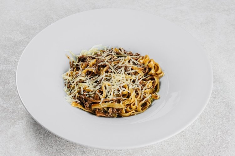 Состав: паста тальятелле, рваное мясо говядины, соус Жю, сыр пармезан