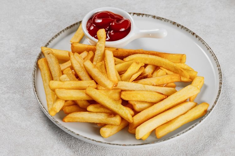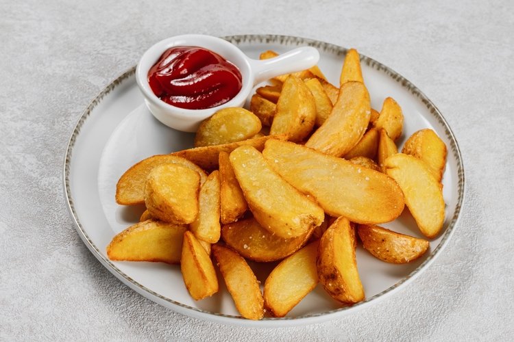 Хрустящие снаружи, мягкие внутри ломтики картофеля с кетчупом