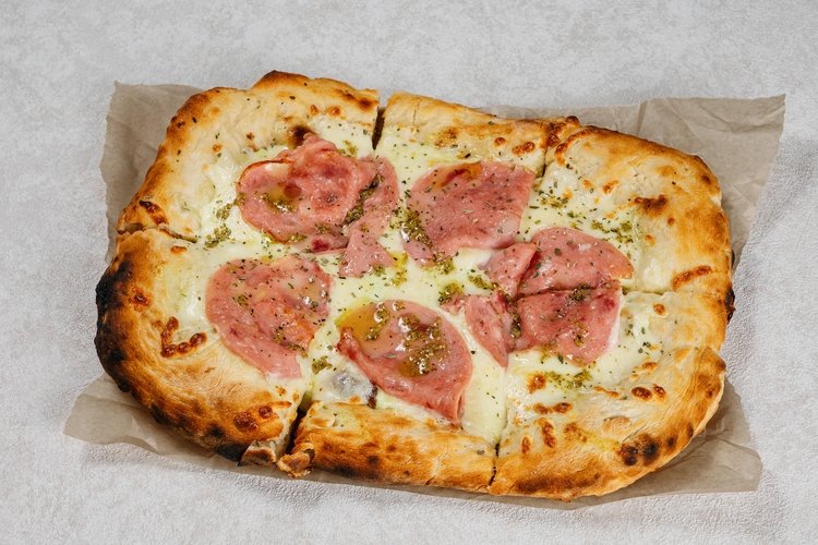 Тонкое, хрустящее тесто, покрытое мягким сливочным соусом, сочной ветчиной и ароматным песто из свежих трав и оливкового масла!