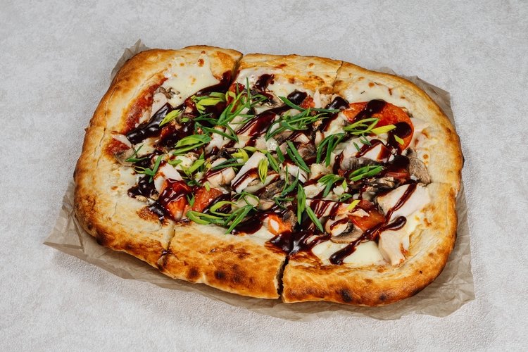 Состав: тесто, пицца соус, сыр моцарела, шампиньоны, куриное филе, томаты, лук порей, соус барбекю