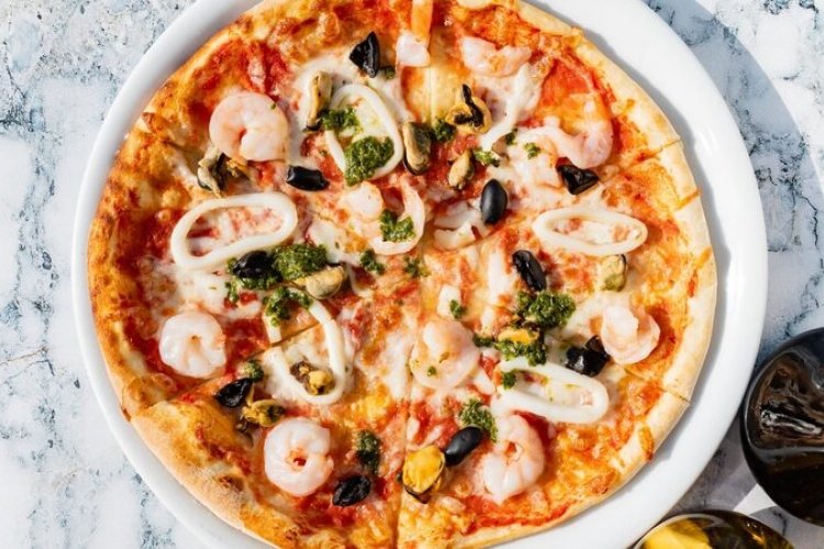 Аутентичная неаполитанская пицца с морепродуктами — нежные креветки и кальмары, украшенные свежими травами и оливковым маслом. Легкая и насыщенная вкусами моря, прекрасно подходит для любителей морской кухни!
